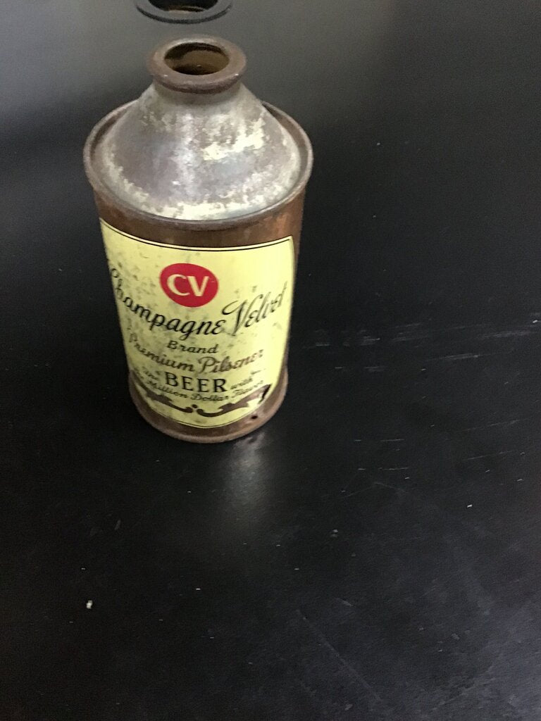 A vintage Champagne Velvet beer can, featuring an iconic label and rustic design. Perfect for collectors or as a nostalgic decor piece.