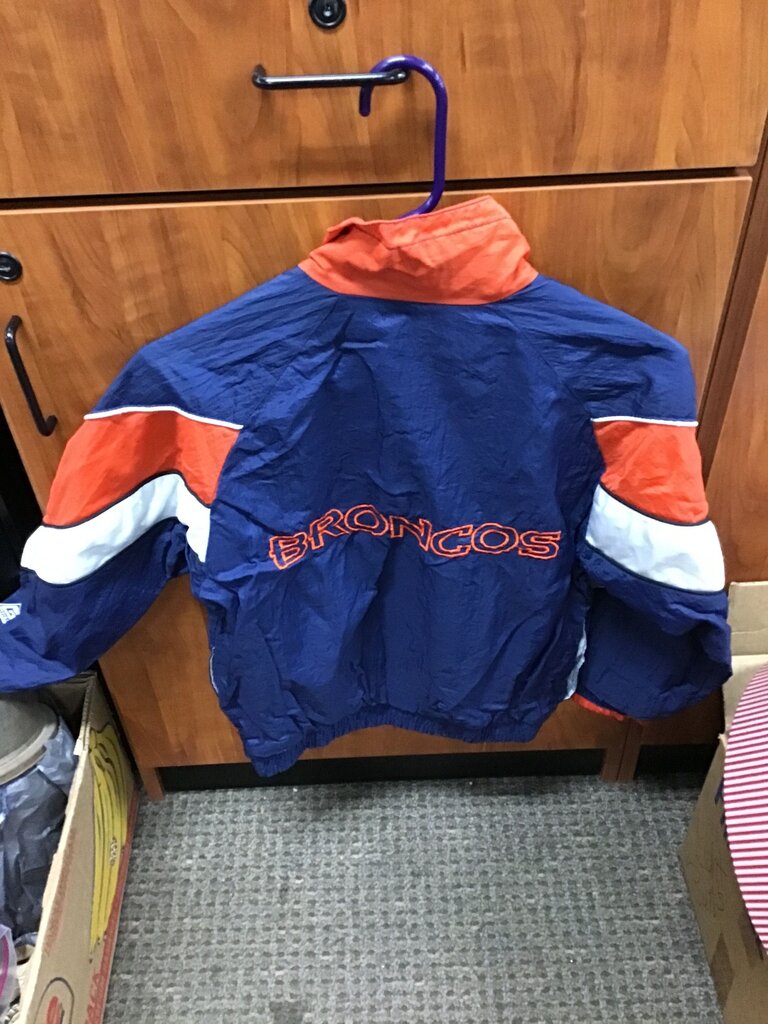 Vintage Denver Broncos NFL Jacket featuring vibrant blue, orange, and white colors. Perfect for any football fan or collector. Team logo displayed prominently on the front and back.